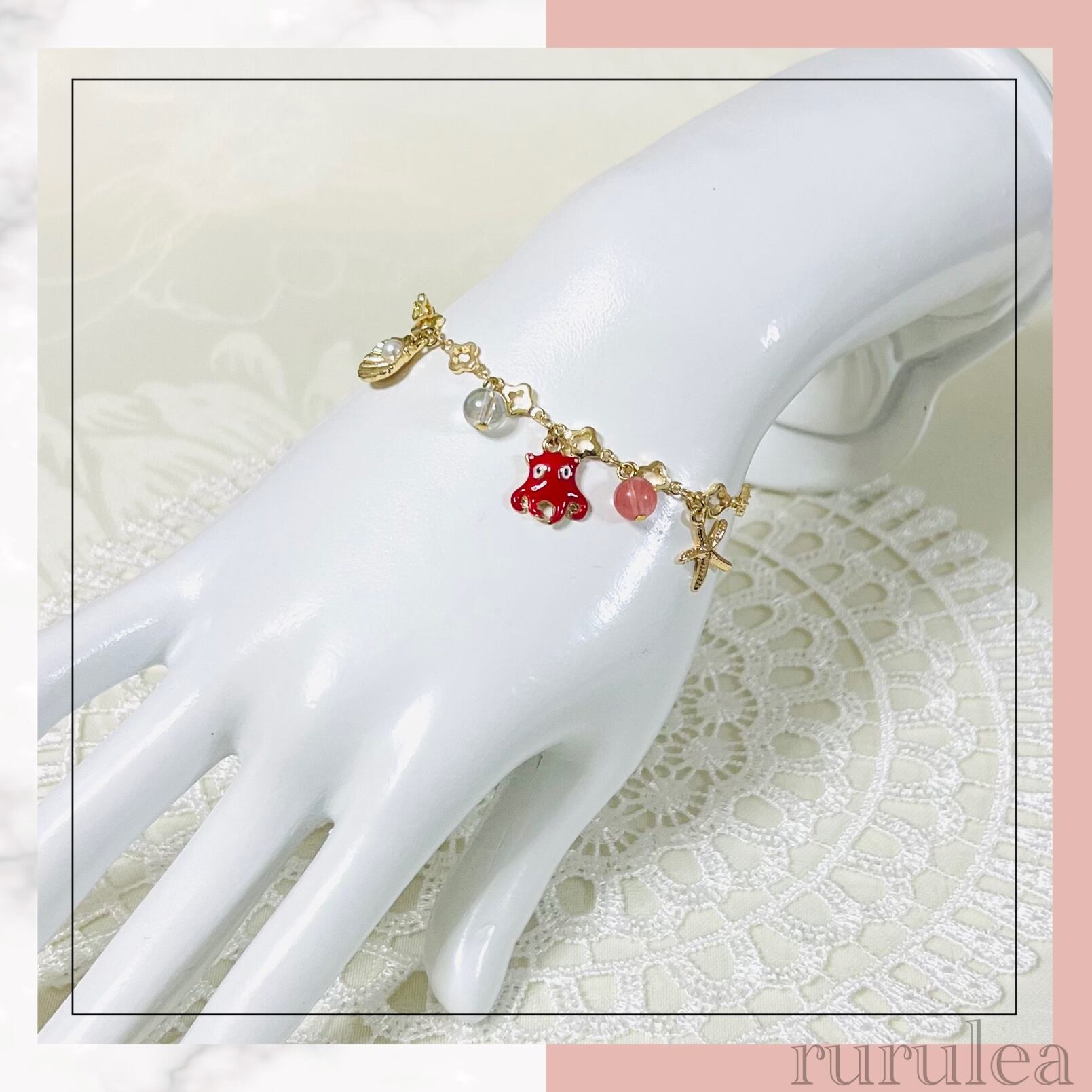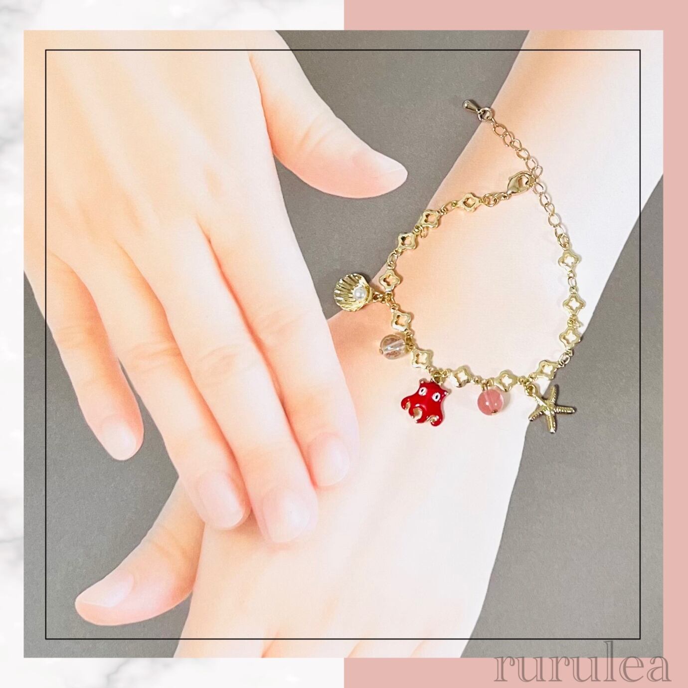 『チェリークォーツ』『レインボークォーツ』を使用したメンダコとパールシェルデザイン天然石ブレスレットです。