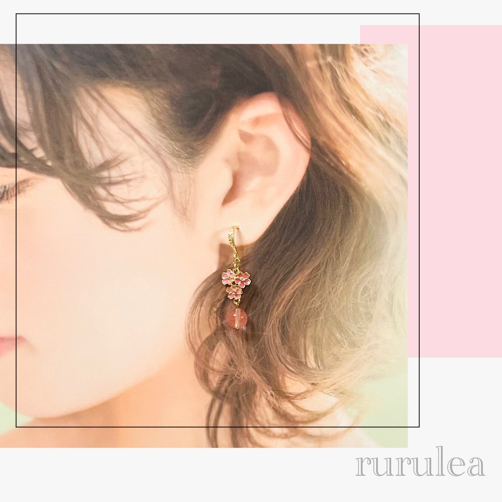 『チェリークォーツ』を使用した桃桜デザイン天然石ピアス/イヤリングです。
