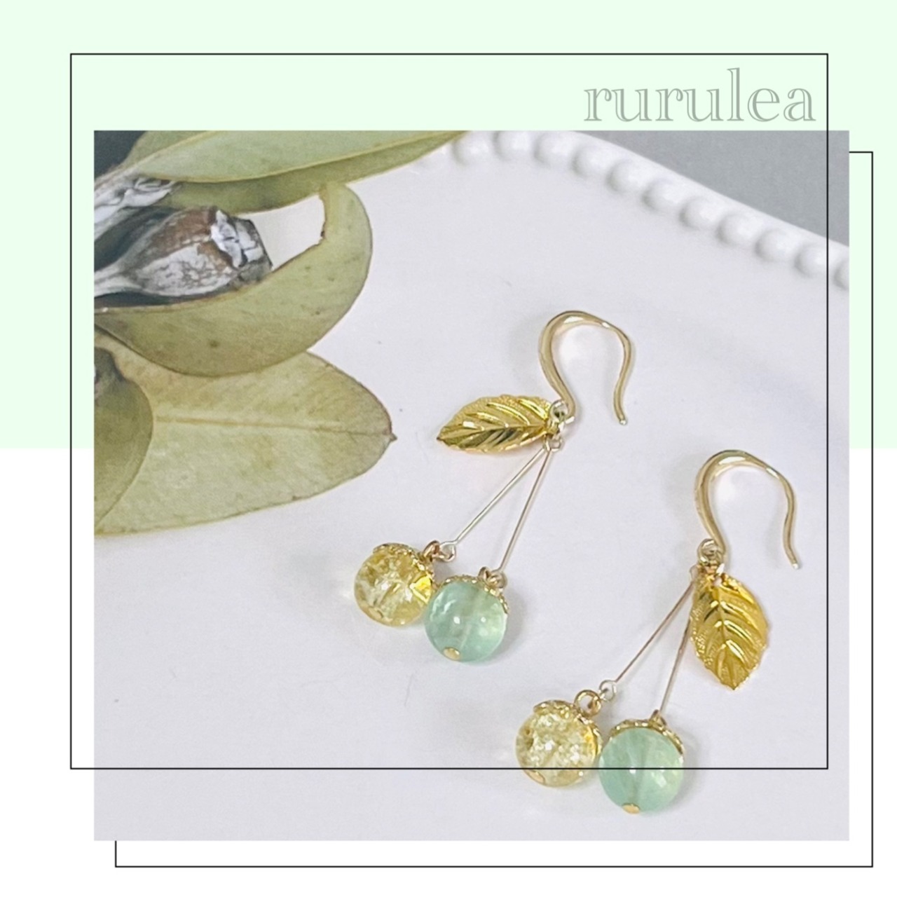 『イエロークラッククォーツ』『フローライト』を使用したチェリーデザイン天然石ピアス/イヤリングです。